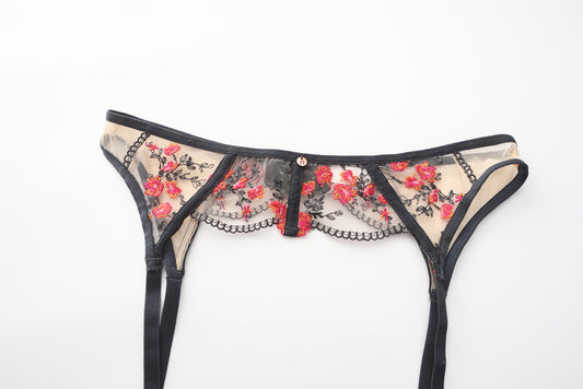daisy embodiery bustier and panty set Sexy Floral Mesh Underwire Push Up Garter Belt Lingerie 2 Piece